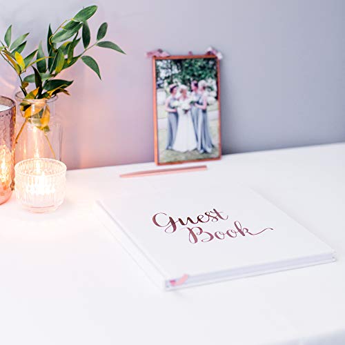 A wedding guest book with a brown cover and 'Guest Book' written in cursive on the front is placed on a white tablecloth. The table is adorned with a lit candle in a glass holder, a small potted plant, and a framed picture of a bride and groom. The scene is set against a wall with a soft pink hue. | [New] Blank Wedding Guest Book Guestbook Rose Gold & White Paper with NO Lines - Registry Books - Rosegold Foil Stamping and 180GSM Paper 32 Pages 64 Sides Square Photo #7 | 4ded663ca75c3b07424be200ab91508b29740a7283809e7cd18832e9c7d97fe5 | 000720932558 | 0 | 0 | 60 | 31 | 0 | 0 | |