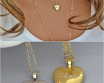 A close-up of a woman's neck wearing a gold heart-shaped pendant with the name 'Elizabeth' engraved on it. The pendant is connected to a chain with a smaller heart-shaped charm hanging from it. The woman's skin tone is fair, and her hair is blonde. | Locket Necklace, Name Locket Necklace, Personalized Heart Locket Necklace Gold or Silver, Engraved Locket, Locket Pendant | 0a3ff22c9929aaf972902984880b07671364951e6ace8e05c7ed01b0c59d6011 | 000720932485 | 0 | 0 | 44 | 16 | 0 | 0 | |