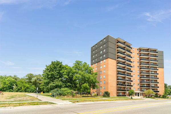 A modern apartment building with a flat roof and multiple balconies is surrounded by lush green trees and bushes. The building has a mix of brick and glass facades, with a prominent black stripe running along the top of the building. The sky is clear and blue, and the scene is set during the day. | 3145 Queen Frederica Dr, Mississauga | be47974bd64c8d68c0cbd691bdb3120f0e4d6af3c19c257117fa45729c14eea3 | 000720932584 | 0 | 0 | 55 | 5 | 0 | 0 | |