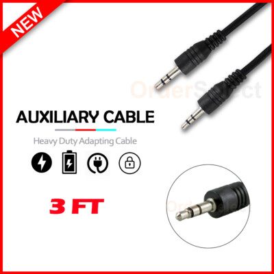 A close-up image of a black 3-foot auxillary cable with a 3.5mm audio jack on one end and a USB connector on the other. The cable has a blue and red color scheme with a white label featuring a lightning bolt, lock, and other icons, along with the text 'AUXILLARY CABLE' and '3FT'. The cable is coiled and placed against ... | 3x 3 FT 3.5mm Auxiliary Aux Male to Male Stereo Audio Cable Cord iPod Car MP3 PC | 87aec1c58e1f1c05ac137f820358909f272bab6c088ca2139b1366d7c4cdd174 | 000720985375 | 0 | 0 | 69 | 17 | 0 | 0 | |