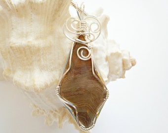 A silver necklace with a pendant featuring a large, smooth, brown stone with swirling patterns, set in a silver frame, is draped over a white surface with a seashell. | Wire Wrapped Pendant, Jasper, Jewelry, Handmade | 36a61216622486a21810c0001145888e41d869e3a446c7867efbef5802fc3c36 | 000720985223 | 0 | 0 | 29 | 6 | 0 | 0 | |