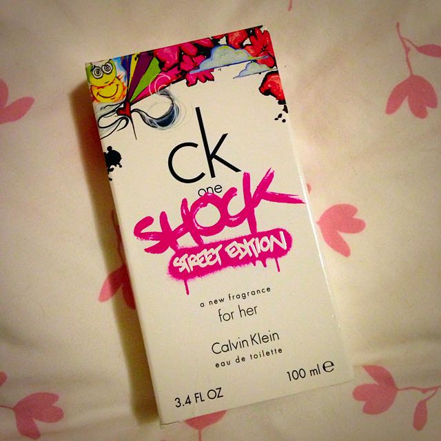 A bottle of Calvin Klein's CK One Shock Street Edition perfume is placed on a white surface with a pink floral pattern. The bottle has a colorful label with a floral design and the words 'CK One Shock Street Edition' written in bold letters. The cap is off, and the bottle is almost full. | Calvin Klein Shock One For Her 100ml | fb39bfacbf240128161cd80df9bb8cd1f536b00747e9ff7b44ad30fa86ee8181 | 000720985319 | 0 | 0 | 54 | 7 | 0 | 0 | |