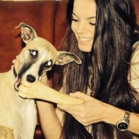 A woman with long hair is holding a large dog bone in her hand, with a dog sitting next to her. The dog has a brown and white coat and is looking at the bone. The woman is smiling and appears to be playfully interacting with the dog. | Elisa N - Profile for Pet Hosting in Australia | 8c75fecc609ef44684e9f0ae6211740b2f93395eafddee4243744943d7529970 | 000720985343 | 0 | 0 | 48 | 9 | 0 | 0 | |