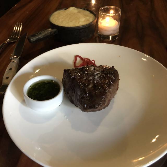 A plate of food is presented on a wooden dining table. The plate contains a piece of meat, possibly steak, garnished with red onion rings and a sprinkle of white seasoning. To the left of the plate, there is a small bowl of green sauce. In the background, there is a bowl of mashed potatoes and a lit candle in a glass h... | STK - Los Angeles, Los Angeles, CA | 06512cc143f569c6bf8fdfd3e57528bd65fef63c0744281877f8084040ae92e1 | 000720985275 | 0 | 0 | 84 | 7 | 0 | 0 | |