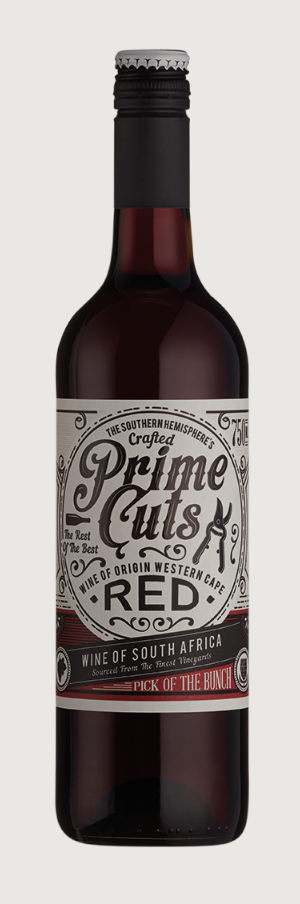 A bottle of 'Prime Cuts Red' wine with a label featuring a vintage design, including a black and white illustration of a man and a woman, surrounded by ornate text and patterns. The label is predominantly red with black and white accents. The bottle has a dark red liquid inside and a black cap. | Prime Cuts Red (Western Cape NV) 75cl | 7bb3463274af4bf0a08c3227c881362e9485eda413d40fb72d03c41eed6b46f6 | 000720985150 | 0 | 0 | 54 | 7 | 0 | 0 | |