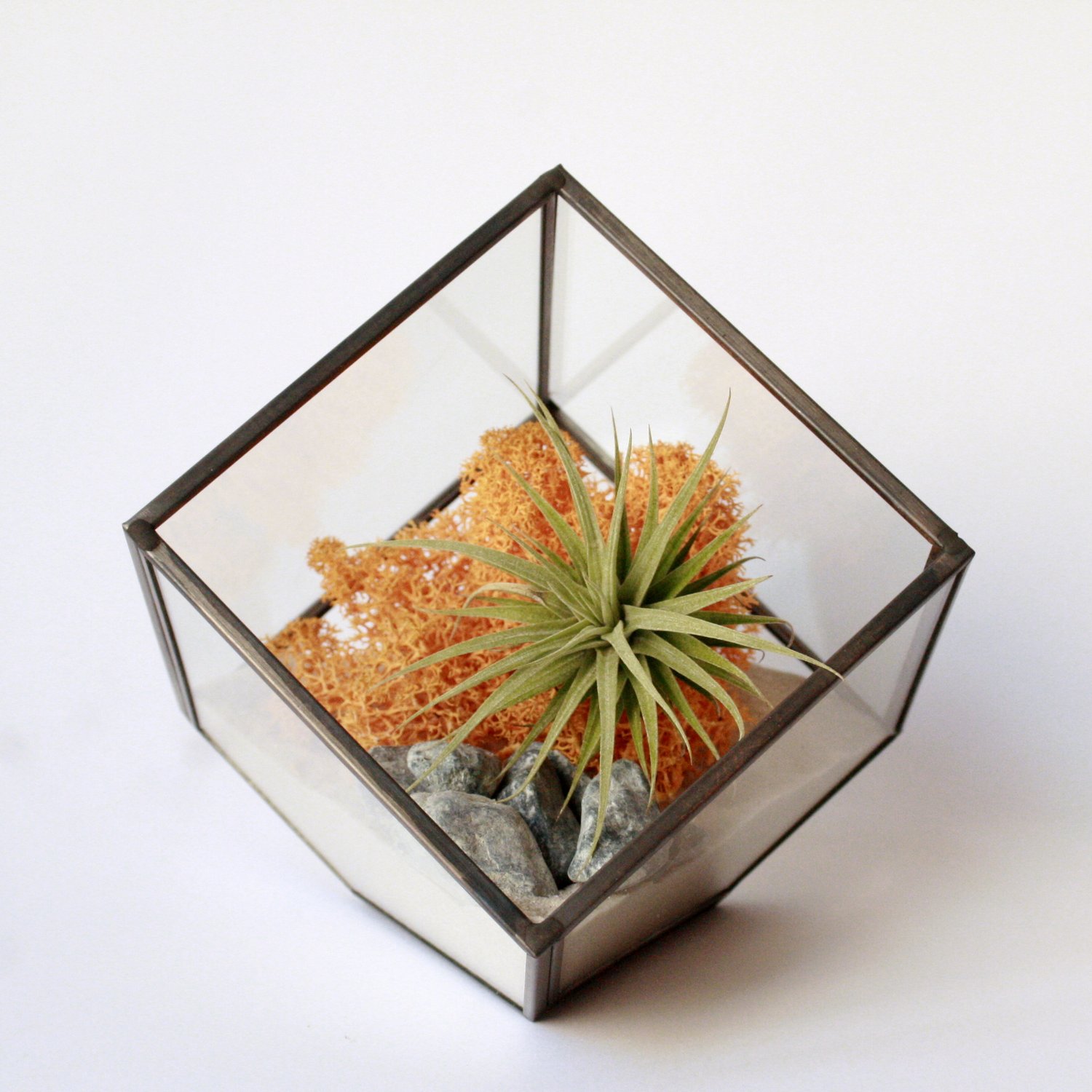 A geometric glass terrarium with a clear glass frame, containing a small potted plant with yellowish-green leaves and a few brownish stems, surrounded by small rocks and a layer of brownish plant material at the bottom. | Image of terrario geometric ionantha | 04a586115a1b511dec63664df2b02ecfc2981b1b4dc2e2d878bb8b16c64fa839 | 000720932694 | 0 | 0 | 36 | 5 | 0 | 0 | |