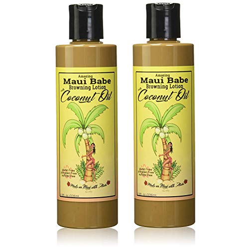 Two bottles of coconut oil with a label featuring a woman in a tropical setting, surrounded by palm leaves and a coconut tree. The label reads 'MAUI BABE CROWING LOTION COCONUT OIL' and 'MAUI BABE BROWING LOTION COCONUT OIL'. The bottles are placed side by side on a white surface with a soft shadow beneath them. | Maui Babe Browning Tanning Lotion Set! Includes 2 Browning Lotion 8 oz and Tote Bag! Tanning Lotion Infused With Coconut Oil! Made on Maui With Aloha! Gluten Free, Paraben Free & Sulfate Free! | 00801b76c429fba72fbe04c5ebd8a45f98d7beb07276b178be7c2f0a63cddf6b | 000720932361 | 0 | 0 | 56 | 33 | 0 | 0 |