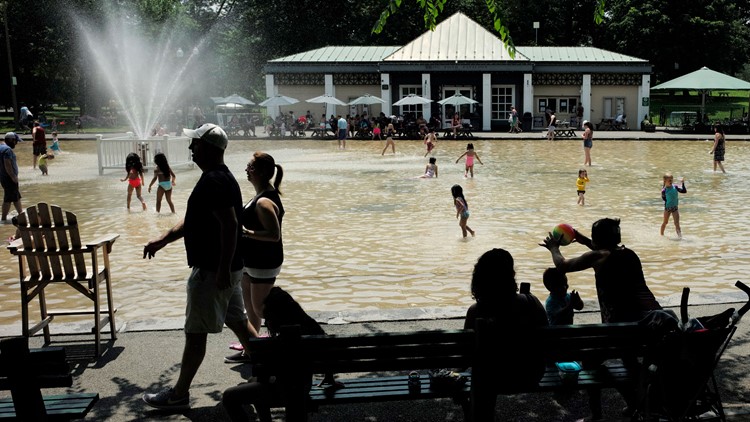A bustling public swimming pool scene with numerous people enjoying the water. A man in a black shirt and white hat stands near the edge of the pool, looking out over the water. A woman in a black tank top and white shorts sits on a bench, holding a frisbee. The pool is surrounded by a building with a green roof and a gazebo-like structure. There are several umbrellas set up around the area, and the sky is clear. | Dangerous heat wave expected to hit two thirds of the US through the weekend | 4141daa29367a9e6a9e05b14a2e04f3095d4b82ba52cdba4addc2b50e716f553 | 000720932753 | 0 | 0 | 79 | 14 | 0 | 0 | |