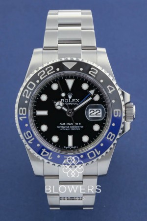 A silver wristwatch with a black dial and blue accents is displayed against a blue background. The watch features a date display at the 3 o'clock position, a small seconds sub-dial at the 6 o'clock position, and a power reserve indicator at the 9 o'clock position. The watch has a silver case and a silver bracelet with a deployant clasp. The brand name 'ROLEX' is visible on the dial, and the watch is engraved with 'BLowers' and a logo on the case back. | Rolex GMT-Master II model reference 116710BLNR | 589dd13b9c912fb646ceb12a762d67a89db7fc9aa325954cbf885500b6b37cf1 | 000720932715 | 0 | 0 | 83 | 6 | 0 | 0 | |