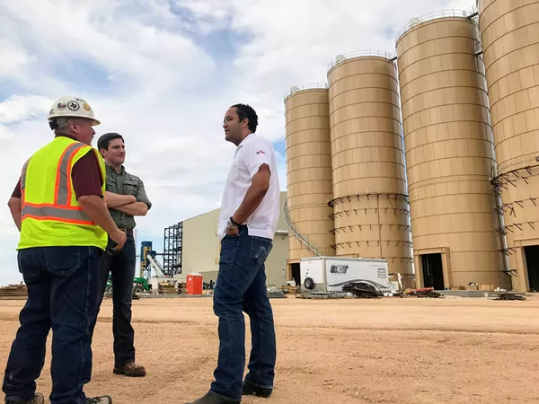 A group of construction workers is standing in front of a large industrial facility with multiple silos. The workers are wearing high-visibility vests and are engaged in conversation. One worker is wearing a white shirt with a logo on the sleeve, and another is wearing a white shirt with a red logo on the sleeve. The facility appears to be a grain silo or a similar industrial structure. | Congressman Will Hurd tours a mine facility Winkler County used to produce sand for the fracking industry. - VIA WILL HURD'S TWITTER | c7ae4e0dbf94535822a6264c07c3ce9d8715398c5cd772f38ce5c49d14cf261d | 000720933337 | 0 | 0 | 68 | 22 | 0 | 0 | |