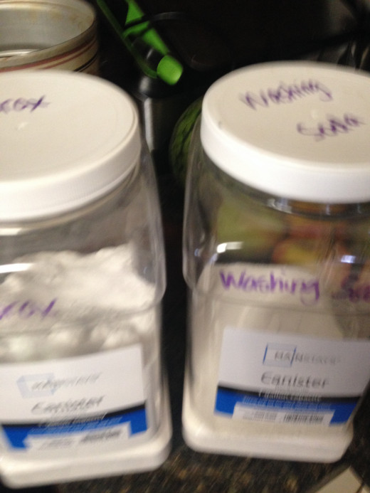 Two identical glass jars with white lids are placed side by side on a surface. Each jar contains a white substance, possibly sugar or flour, and has a label with handwritten text. The labels read 'SALT' on the left jar and 'SUGAR' on the right jar. The jars are surrounded by various kitchen items, including a green spoon, a metal pot, and a canister with a red lid. | I keep my washing soda and borax in containers for easier storage | f5327690d50bf31c709745a97ec0f92ac6596019935167a4d84aad781900e234 | 000720933380 | 0 | 0 | 68 | 12 | 0 | 0 | |