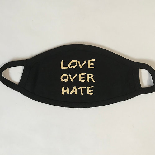 A black face mask with the words 'Love Over Hate' written in gold cursive font on the front. The mask has a black strap on the right side and is placed against a white background. | Love Over Hate Facemask | db9a0f1cd4f5b4754b6edc27f24a171c5af2f490fb50bd5d7b0eb694da02a975 | 000720933923 | 0 | 0 | 35 | 4 | 0 | 0 | |