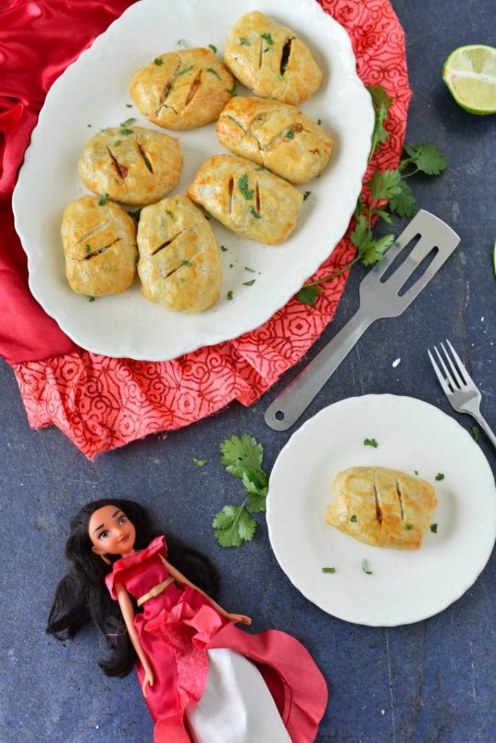 A plate of baked empanadas garnished with parsley and a doll dressed in a red dress with a white apron is placed on a dining table. The table also has a fork, a knife, and a lime wedge. | Princess Elena Recipe | 6373e7f60bc4d5d1e78bf28b91271b16b792f179ce9fb7515d8b997a8b0ac580 | 000720933849 | 0 | 0 | 38 | 3 | 0 | 0 | |