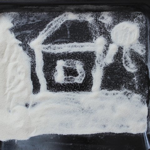 A black and white image of a child's drawing of a house with a tree and a ball, made with flour on a surface. | Drawing in semolina | 5ff47f6f66b5950009bbcaf53bac8cf5bcc09e7f11e432dd8e1e1aa600804c88 | 000720933947 | 0 | 0 | 24 | 3 | 0 | 0 | |