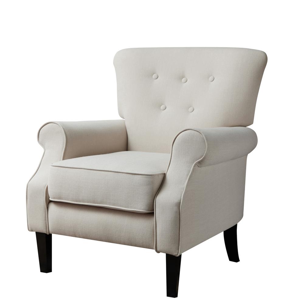 A modern, minimalist armchair with a simple, clean design featuring a high backrest with button tufting, a straight back, and a low, flat seat cushion. The chair has a light beige fabric upholstery and is supported by four straight, dark wooden legs. | Cream Beige Upholstery Arm Chair | 584f0f1151a28d713cfe4a46dea99b03ae3b66d9493bb9b60fb7428ec4a26d9e | 000720935935 | 0 | 0 | 42 | 5 | 0 | 0 | |