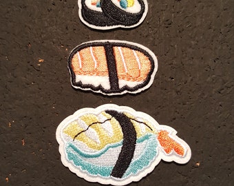 A collection of three embroidered patches is displayed on a dark surface. The patches are arranged vertically, with the top patch featuring a stylized image of a butterfly with orange and black wings, and the middle patch depicting a sushi roll with a pattern of orange and white fish slices. The bottom patch shows a whimsical design of a fish with a smiling face, wearing a hat, and surrounded by water. | 3pcs Sushi Iron On Patches | a21f62ce9b7b9facec0ed9b212c4ed8b5316406ba03fdc1b2baf2697fdb229d9 | 000720935815 | 0 | 0 | 71 | 5 | 0 | 0 | |
