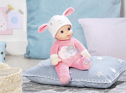A plush toy of a baby rabbit wearing a pink onesie and a white hat is sitting on a blue cushion with a star pattern. The toy is placed on a grey rug with a white knitted basket to the left and a blue pillow with a striped pattern in the background. | Zapf Creation 702536\xc2\xa0Baby Annabell Sweetie for Babies 30\xc2\xa0cm, Color Rosa | 8a048252ca743829d85c3e51fb6d0dd3867656d59806a45ea976be8dd2c117d7 | 000720935927 | 0 | 0 | 52 | 10 | 0 | 0 | |