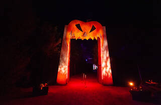 A nighttime scene with a large, illuminated orange and black pumpkin-shaped archway in the center. The archway is surrounded by a dark, tree-lined path with red lights leading up to it. To the left of the archway, there is a small, dark figure with a glowing red light source, possibly a lantern. To the right, there is a small, dark figure with a glowing red light source, also possibly a lantern. The ground is covered with red gravel, and the overall atmosphere is eerie and festive. | Halloween Road 2021 | 04fdb38fcc720f6005a00c5ef994ba80fe14c5eaaff8866d585bc2ac52ebff3c | 000720935965 | 0 | 0 | 86 | 3 | 0 | 0 | |