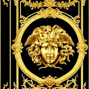 A golden ornate frame with a detailed design featuring a central figure with a coiled hairstyle, surrounded by intricate patterns and motifs. The frame is set against a black background, and the gold is highly reflective, giving the image a luxurious and antique appearance. | 1 Versace inspired medusa baroque rococo black gold flowers floral filigree swirls scrolls victorian festoon medallions leaves leaf swags ornate acanthus gorgons Greek Greece mythology | cb20c07bfe486f86ce50a2ccf296c46c49aa2435cf3ec45b6cf3ba01277b9c91 | 000720935945 | 0 | 0 | 44 | 25 | 0 | 0 | |