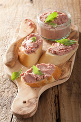 A rustic wooden table is set with a wooden cutting board holding three slices of bread topped with a pink spread and garnished with green herbs. A small glass bowl filled with the same spread is placed next to the cutting board. | healthy chicken liver pate with sage in jar and on bread | e3be7b8b73de1b051c253fccced52a5cdc4657dc49aa14d1e09f7fd46acb869c | 000720935928 | 0 | 0 | 42 | 11 | 0 | 0 | |