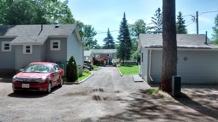 A red car is parked in front of a house with a gray roof and white siding. The house has a small porch with a railing and a window with white trim. There is a green tree to the left of the house and a wooden fence in the background. The driveway is made of gravel, and there are tire tracks leading to the house. | Enjoy Kawartha Lakes here at our 1 Bedroom Cottage | b8e1d8296c8ce751bd65ad05e740c28d7908a78e56a778ef6cf6c7fc27ff47b8 | 000720936227 | 0 | 0 | 65 | 9 | 0 | 0 | |