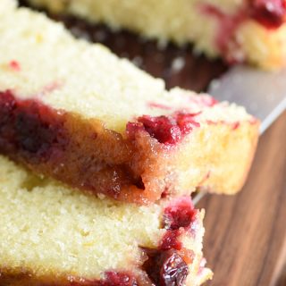A slice of cake with a layer of red fruit topping is placed on a wooden surface. The cake appears to be a vanilla sponge cake with a moist texture, and the fruit topping is a mixture of red berries, possibly raspberries or strawberries, with a glossy sheen. The slice is cut diagonally, and there is a knife with a wooden handle resting on the cake. The background is out of focus, emphasizing the cake and the fruit topping. | Cranberry Upside-Down Quick Bread | ccf5991f3e62f4183b446b31bafe035bca00d904a528f2e83a1a1d53197dbbd9 | 000720936260 | 0 | 0 | 79 | 4 | 0 | 0 | |