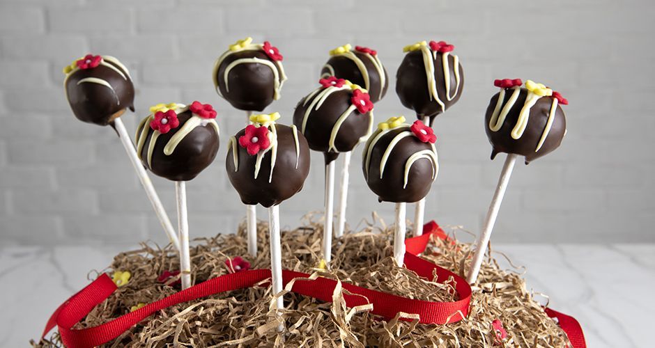 A collection of chocolate truffles with white and red icing on top, each placed on a wooden stick, are arranged on a red ribbon-wrapped base. The truffles are decorated with red and yellow sprinkles, and the sticks are inserted into a brown paper base. The background is a white brick wall. | Recipe main cake pops me koulourakia site | 52882634b1de087aa9a5cd92926c6639e3bb732a15097bf67240779c4cd76b88 | 000720936233 | 0 | 0 | 51 | 7 | 0 | 0 | |