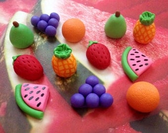 A collection of colorful plastic fruit shapes, including strawberries, watermelons, and bananas, are arranged on a surface with a pink background. The fruits are placed in a way that mimics the arrangement of real fruits on a table. | Fondant Fruit Foodie Cupcake - Cake Decorations | c3f61c7b6df7f7ed25aa6ad48f590bddb5fc34a640859b4d0630728834b94654 | 000720936267 | 0 | 0 | 38 | 7 | 0 | 0 | |