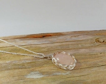 A close-up of a silver necklace with a pink gemstone pendant, resting on a textured wooden surface. The background is a plain, light-colored wall. | byNesse - rosequartz necklace - crystal pendant - silver necklace - silver wire pendant - sterling silver necklace - pink necklace - pendant | 85a3db37a738a7a5274bf64b59da5433c2ada6dda6333182407740296228de9f | 000720936015 | 0 | 0 | 24 | 23 | 0 | 0 | |
