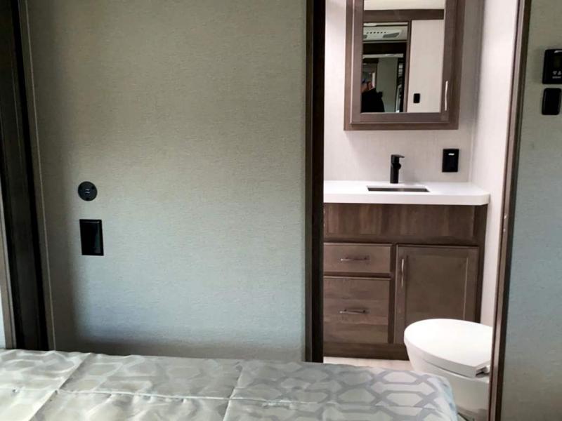 A modern bathroom with a white toilet, a sink with a mirror above it, and a wooden cabinet below the sink. The bathroom has a beige wall and a white tiled floor. There is a bed with a white and beige comforter in the foreground, and a door with a digital lock on the left side. | 2022 Grand Design RV SOLITUDE 346FLS | eaa334aa717fb8604d513d926fa8bfd7df7bf03b87f4d4589dc00330ec70ca32 | 000720936331 | 0 | 0 | 56 | 6 | 0 | 0 | |