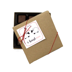 A brown cardboard box with a red ribbon tied around it, containing two pieces of chocolate. On top of the box, there is a white sticker with a black sheep illustration and the text 'I HEART EWE' in red. The box is placed against a white background. | Farm Sanctuary I Heart Ewe! Salted Melk Caramels | a03176b61f44e3d05c7c9ad0f78045515ad36284e25c4139c667d7d7c1379414 | 000720936393 | 0 | 0 | 47 | 8 | 0 | 0 | |
