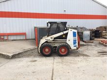 A small, white utility vehicle with a flatbed and a metal cage on top is parked in front of a building with orange and white stripes. The vehicle has red tires and is positioned on a concrete surface with a few puddles around it. There are wooden planks and a metal barrel to the right of the vehicle, and a bench is visible in the background. | Bobcat 743 Skid Steer | ac9c570fd09249e2186e16f01ac61341d603142b3527a619440764d8b0f0c5d1 | 000720936808 | 0 | 0 | 66 | 4 | 0 | 0 | |