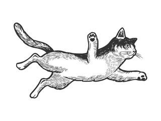 A black and white illustration of a cat in mid-air with its front paws raised. The cat is depicted with a playful expression, and its body is stretched out in a dynamic pose. The background is a plain white color, and the illustration is detailed with fine lines and shading to give it a textured appearance. | Jumping cat animal flies sketch engraving vector illustration. Tee shirt apparel print design. Scratch board style imitation. Black and white hand drawn image. | 43fc151044f703df94a7c1d0ba975ed18cc1573a7bbe5b32b202e9d9e498bdcb | 000720936765 | 0 | 0 | 56 | 23 | 0 | 0 | |