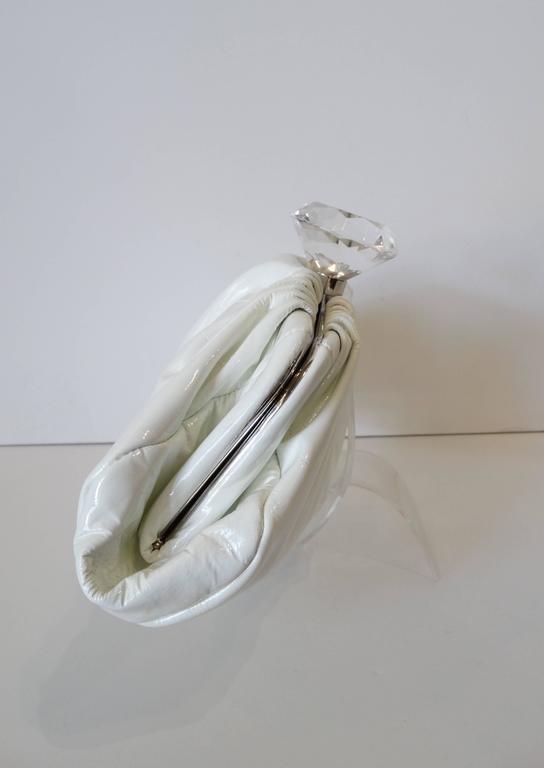 A white handbag with a metallic zipper and a metallic clasp is placed on a white surface. The handbag is open, revealing its interior, and the metallic zipper and clasp are visible. | Women's 2000s Chanel Diamond Patent Leather Clutch For Sale | 183451779334e814cb2f8c7252551a81a4dfa20d314271afe8b48e4a87bf3c97 | 000720936971 | 0 | 0 | 32 | 9 | 0 | 0 | |