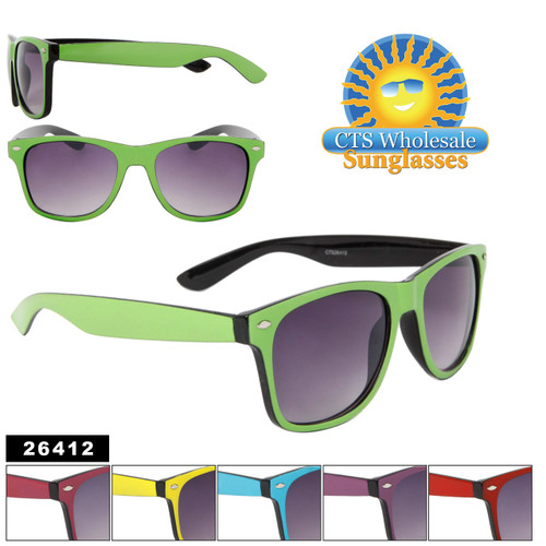 A pair of sunglasses with a green frame and purple lenses is displayed against a white background. Above the sunglasses, there is a logo that reads 'CTS Wholesale Sunglasses' with a sun icon and a smiley face. The logo has a yellow background with a gradient effect. Below the sunglasses, there is a barcode with the number '264412'. | New Two Tone California Classics Sunglasses Item # 26412 | c61e785f328e402bb4b791a03ec7933a200d4ec8d0b634f028aed2aeaf22962c | 000720936921 | 0 | 0 | 58 | 9 | 0 | 0 | |