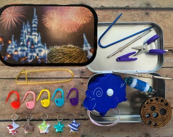 A collection of colorful beads, including star-shaped ones, is displayed on a wooden surface. The beads are arranged in various shapes and sizes, with some hanging from strings and others placed individually. A small blue container with a spiral design is also present, along with a pair of scissors and a purple tool. In the background, there is a decorative item with a woven design and a small image of a castle. | Travel Knitting Kit - Cinderella\xe2\x80\x99s Castle | 7080abdbc391482543203ae3c12a25f24e7bc9cf272440563dd8c2fc6fc2e94b | 000720936763 | 0 | 0 | 72 | 6 | 0 | 0 | |
