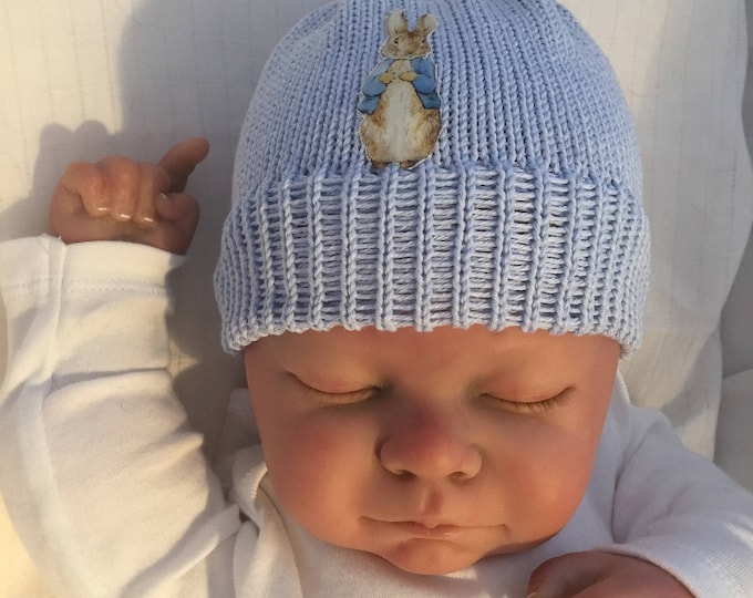 A baby doll wearing a blue knitted hat with a white rabbit embroidered on it is lying down with its arms raised. | knitted hand made baby /child beanie hat blue knit peter rabbit inspired beanie hat cotton girl/boy sizes from newborn gift photo prop | 20453291dfe250e57d723dda46da674a775fd51d8822f32379a0ddd1bb0e7a9f | 000720936860 | 0 | 0 | 22 | 22 | 0 | 0 | |