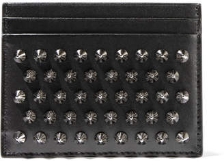 A black leather wallet with a silver metal zipper closure and a silver metal zipper pull. The wallet has a silver metal zipper pull on the top right corner and a silver metal zipper pull on the bottom left corner. The wallet is open, showing the interior with a black fabric lining and multiple card slots. The exterior has a silver metal zipper pull on the top left corner and a silver metal zipper pull on the bottom right corner. | Christian Louboutin Kios Spiked Leather Cardholder - Black | 9466329b71949a1b17b5227b5f0f1cb87f3b5d17cd4ed308f3e4559b676b546b | 000720936933 | 0 | 0 | 80 | 8 | 0 | 0 | |