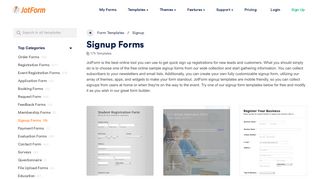 A website design featuring a sign-up form with a header that reads 'Sign Up Forms' and a subheading that says 'Choose one of the many registration forms available to you or create your own custom form. It's easy!'. Below the header, there is a paragraph of text explaining the benefits of using the sign-up form. The design includes a prominent call-to-action button that says 'Sign Up Now' and a section with a testimonial quote. The website also has a navigation menu at the top with links to different sections, such as 'My Forms', 'Templates', 'Support', and 'Log In'. | 200+ Sign Up Form Templates & Examples - JotForm | 886acebe3b031a393f924d32ed0f36ab3b7056f89dc18f687cf419a98ec6a0de | 000720936855 | 0 | 0 | 98 | 9 | 0 | 0 | |