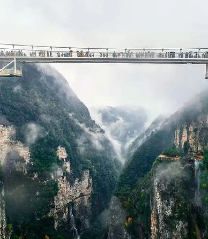 Aerial view of a mountainous landscape with a bridge spanning across a valley. The bridge is crowded with people, and the valley is filled with mist and waterfalls. The surrounding mountains are covered in dense greenery, and the sky is overcast. | Zhangjiajie Grand Canyon and Glass Bridge Ticket | 67b472d4708fa86af0c2a054a29273602f740011eebaf3cf8617722c3038f45e | 000720937344 | 0 | 0 | 41 | 7 | 0 | 0 | |