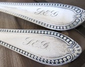 A pair of silver spoons with intricate designs and engraved initials 'JG' on the handles are lying on a wooden surface. | Antique Silverplate Forks Engraved S.E.G., Beaded 1855 pattern Set of 2 | 1b9ea008dcee96344e8d7e556a08e988a4e57a90be7efabf0e53ba0066acee98 | 000720937202 | 0 | 0 | 21 | 11 | 0 | 0 | |