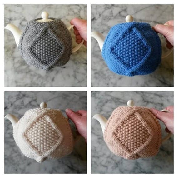 A collection of four knitted teapots in different colors is displayed. The first teapot is beige with a white knitted pattern, the second is blue with a white knitted pattern, the third is brown with a white knitted pattern, and the fourth is gray with a white knitted pattern. Each teapot is held by a hand, and the background features a marble countertop. | Knitting Pattern: Aran Teacozy. Instant PDF download. Aran Teacosy. Original design. Digital download. Teapot cover. Teacozy knit pattern. | f75debd73215b44a2b3c944eaee8bcabb0640f1c3ef62d9d439f229dd64ff928 | 000720937242 | 0 | 0 | 63 | 18 | 0 | 0 | |