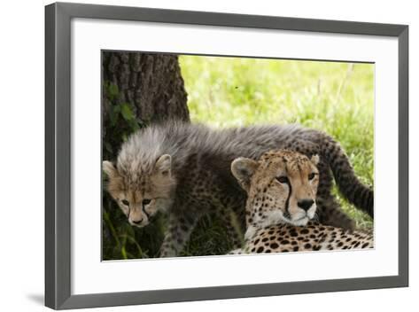 A framed picture of a cheetah cub and an adult cheetah resting under a tree. The cub is on the left, looking towards the viewer, while the adult cheetah is on the right, facing away. The background shows a grassy field with a few trees and a clear sky. The frame is a simple, dark grey color. | Cheetah and Cub, Masai Mara, Kenya-Sergio Pitamitz-Framed Art Print | eff57dd29cf9f1dc89be90ea744a1331718d1e66decc0726c677dd97aa4c5943 | 000720937151 | 0 | 0 | 57 | 9 | 0 | 0 | |