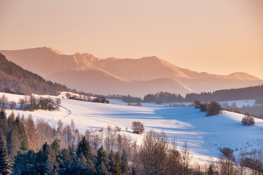 A snowy mountain landscape with a clear sky, featuring a winding road through the snow-covered terrain and a few sparse trees. | Snowy winter landscape with mountain range in the background at morning light. The Mala Fatra national park in Slovakia, Europe. | a9d31a80fb8606655d26708552f66a82bffc494de2719ab7e2b72f8e88cc41bd | 000720937309 | 0 | 0 | 21 | 20 | 0 | 0 | |