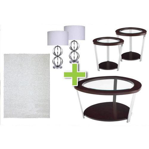 A modern glass coffee table with a round top and a black metal base is displayed against a white background. The table is accompanied by a beige rug, a white lamp with a round shade, a pair of round wall sconces, and a set of three round glass side tables with black metal legs. | 6-Piece Duncan Tables, Brushed Nickel Lamps and Spangle Ivory Rug Bundle | ff2b194b8451da266e532d02c36041f09c809f1548a002a56d4c5509159bb50d | 000720937987 | 0 | 0 | 54 | 11 | 0 | 0 | |