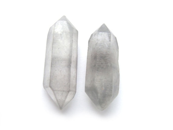 Two clear, faceted crystals are placed side by side against a white background. The crystals have a smooth, transparent appearance with a pointed tip at the top and a flat base at the bottom. | Rare Pale Grey Raw Quartz Crystal Point Stud Earrings | 41aa6ac7706c29b8eba16ad81fc75bececf097a8f52ed49f266417ee076d7d82 | 000720937866 | 0 | 0 | 34 | 9 | 0 | 0 | |