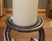 A white candle with a smooth surface is placed on a metal candle holder with a horseshoe design. The holder is mounted on a wooden surface, and the candle is lit, casting a warm glow. | Horseshoe Pillar candle holder | e8286256fd07cb1f31bec1455c9c57b77dd5df44b7a3354ba64d0d0cb2c1cc14 | 000720938046 | 0 | 0 | 35 | 4 | 0 | 0 | |