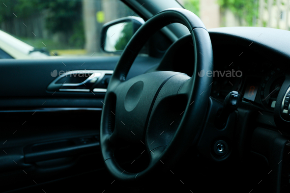 The first image shows a close-up of a car's interior, focusing on the steering wheel and the area around it. The steering wheel is black and has a circular design with a prominent center hub. The dashboard is also black, and there is a gear shift lever to the right of the steering wheel. The image is overlaid with a watermark that reads 'GENUATO' in white text. The overall image has a dark, moody atmosphere with a focus on the textures and details of the car's interior. | Car interior. Blank steering wheel. Sedan interior - Stock Photo - Images | 6f21e3fc32ddf819f60a67dcc9ba09b8f83f32d0f744ef073d155db54d622255 | 000720937857 | 0 | 0 | 87 | 12 | 0 | 0 | |