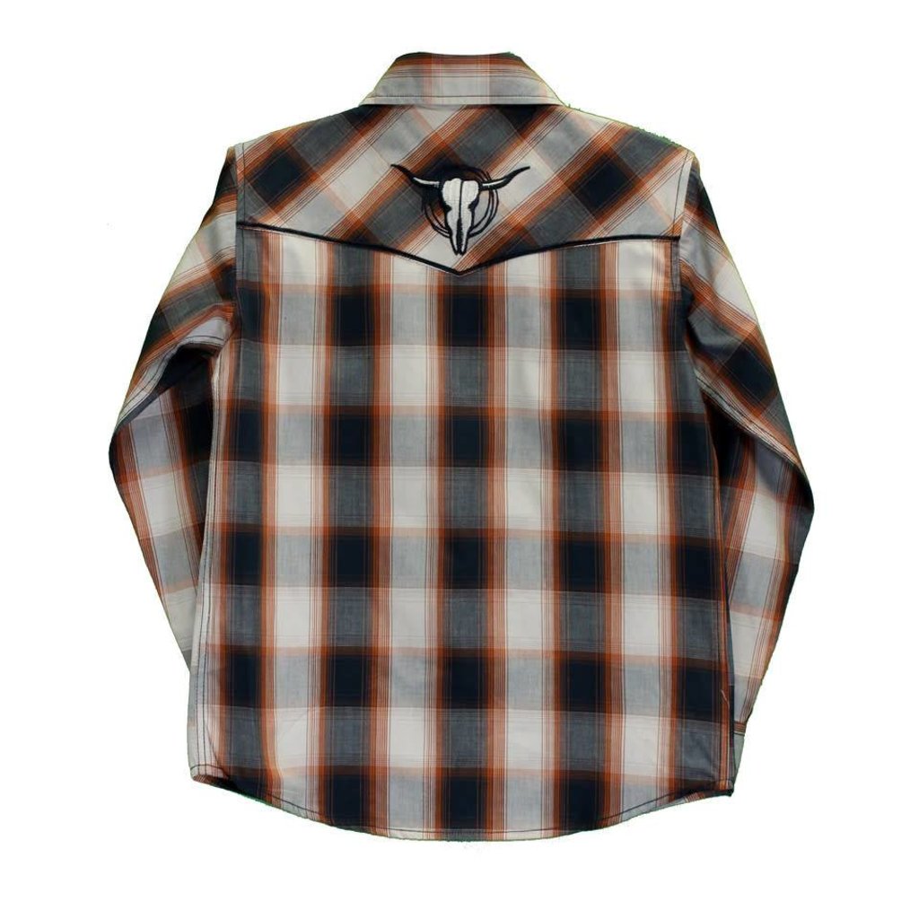 A plaid shirt with a bull skull emblem on the back is displayed against a white background. The shirt has a collar and is buttoned up, showcasing the plaid pattern and the emblem. | Cowboy Hardware Youth Burnt Orange Hombre LS | f704b8e5f341b23e9d049d591e8e5efbe9b406fd13bc42a467c527523eeb6ef5 | 000720938696 | 0 | 0 | 33 | 7 | 0 | 0 | |