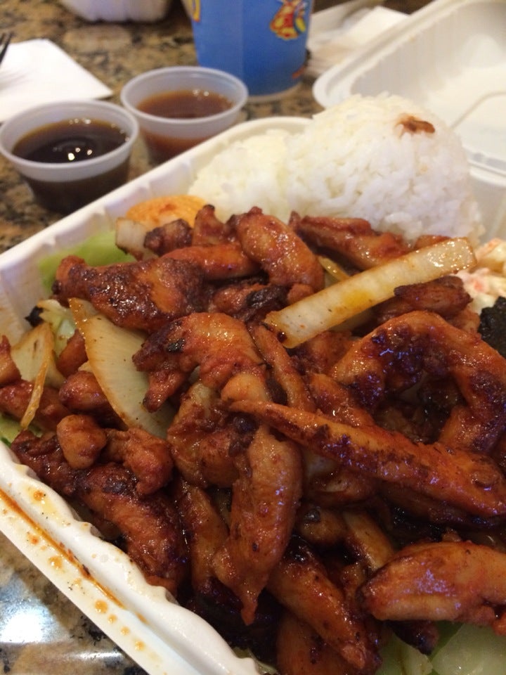 A close-up view of a Chinese takeout meal with a focus on the meat and rice. The meal is served in a white takeout container with a clear plastic lid. The meat appears to be a combination of chicken and beef, with visible grill marks and a slightly charred texture. The rice is white and fluffy, and there are pieces of green vegetables mixed in. The container is placed on a surface with a marble-like texture, and there are two small plastic containers of sauce to the left of the main dish. | Island Fire Chicken | f2efadc4a0c1a828e06be00bcedc2e21a169c347886d3727ec34717c4bf79255 | 000720938746 | 0 | 0 | 92 | 3 | 0 | 0 | |